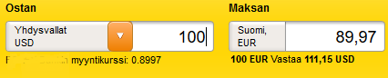 Tee ohjelma, jolla voidaan muuttaa euroja dollareiksi ja päinvastoin. Toteuta muunnos niin että muunnos tehdään sitä mukaan 'reaaliaikaisesti' kun käyttäjä syöttää lukua. Eli toteuta kontrollin Change-tapahtumalle tapahtuman käsittelijä. Pyöristä raha-arvot tulostuksessa siten, että käytössä on vain kahden desimaalin tarkkuus. Käytä dollarin vaihtokurssina arvoa 0,8997. Toteuta myös tarkistus sen varalle että käyttäjän syöte ei ole luku.