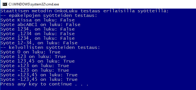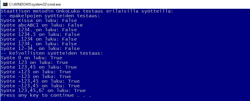 Alla esimerkin omainen Metodin OnkoLuku testaus kelvollisilla ja epäkelvoilla syötteillä.