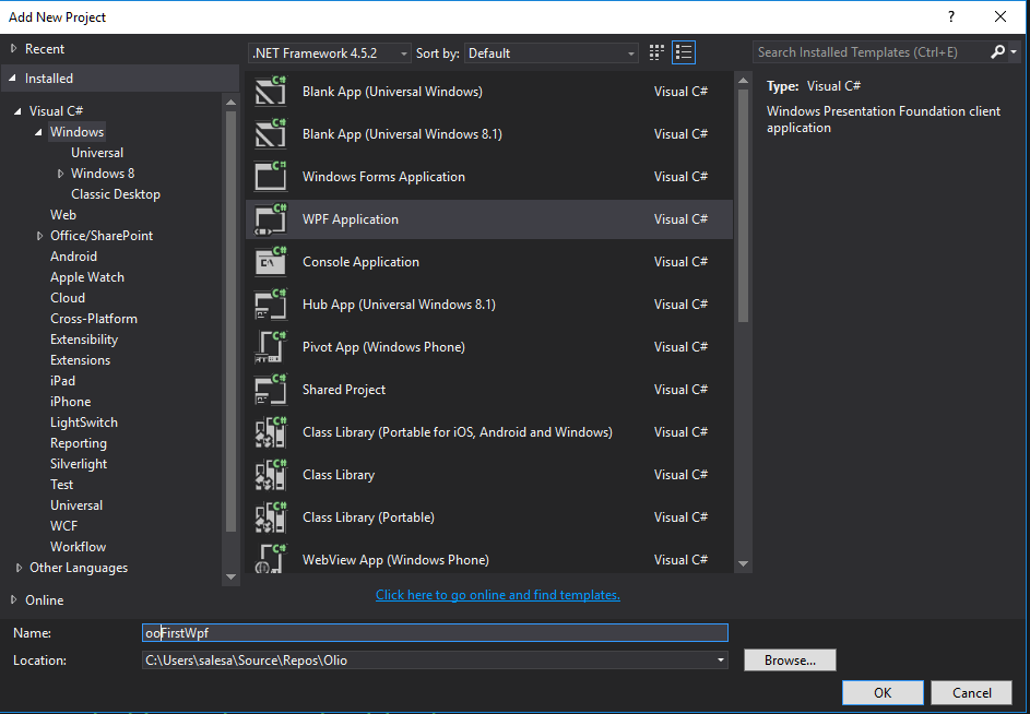 Avaa Visual Studio ja luo uusi projekti, valitse VisualC#|Windows|WPF Application.