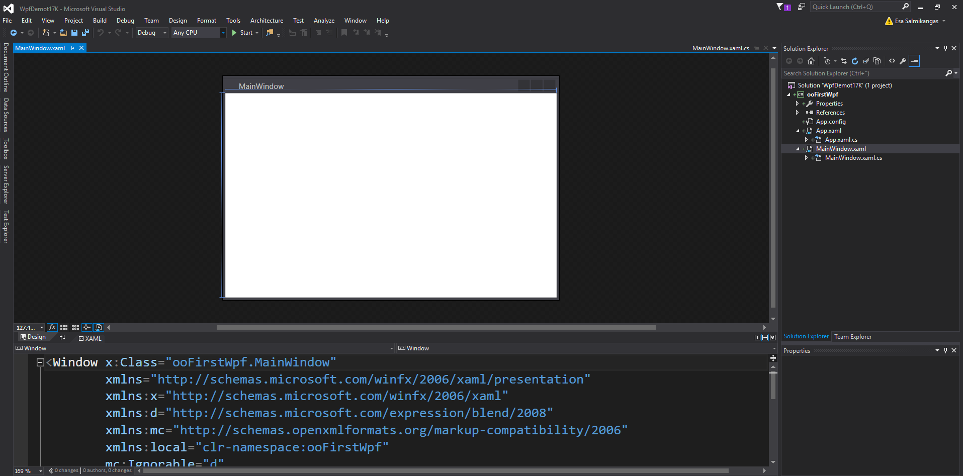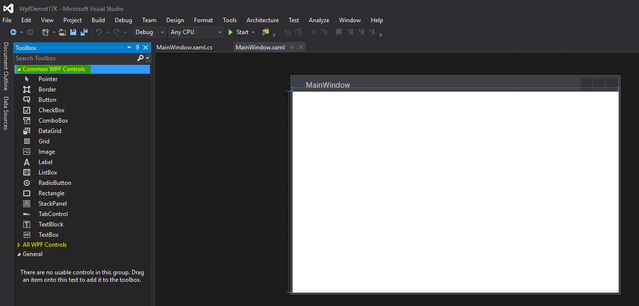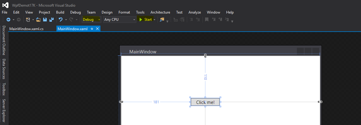Ikkunan sisältöä voidaan muokata käyttämällä Visual Studion Design -editoria tai ohjelmoimalla pääsivuun liitettyä cs-tiedostoa. Pääsivu saadaan avautumaan Visual Studion Design -editoriin tuplaklikkaamalla MainWindow.xaml-tiedostoa Solution Explorerista. Huomaa kuinka Visual Studio antaa muokkaus mahdollisuuden sekä visuaalisesti (yllä) tai XAML-koodiin suoraan koodinäkymän kautta (alla). Pääsivuun liitetty ohjelmointikoodi saadaan näkyville tuplaklikkaamalla MainWindow.xaml.cs-tiedostoa Solution Explorerista.