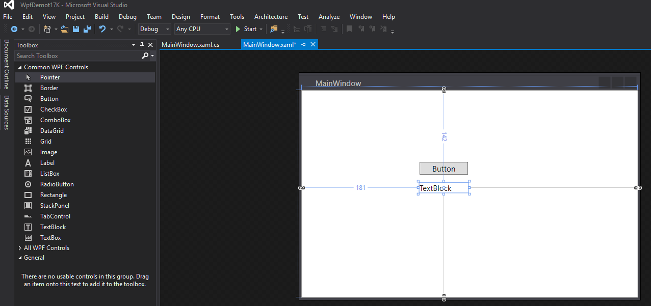 Vedä ja pudota sovellukseen seuraavat kontrollit: Button ja TextBlock. Kontrollien sijoittelulla ei ole tällä kertaa väliä. Huomaa kuinka kontrollit ovat näkyvillä design-editorin puolella sekä xaml-koodieditorin puolella. Tutki myös millaisia elementtejä ja arvoa muodostuu xaml-koodieditoriin puolelle.