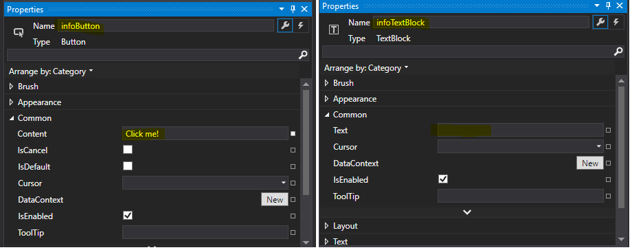 * muuta TextBlock objektin nimeksi infoTextBlock Name-arvon kautta