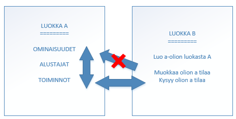 => Olion ominaisuuksiin ei päästetä suoraan käsiksi, vaan toimintojen kautta. Tällöin voidaan estää vääränlaiset olion tilan muutokset toimintojen avulla.