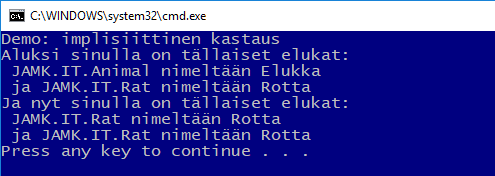 Alla olevassa esimerkissä on käytetty kahta luokkaa: Animal ja Rat. Rat on peritty kantaluokasta Animal. Suoritetaan oheisen koodin mukainen implisiittinen kastaus.